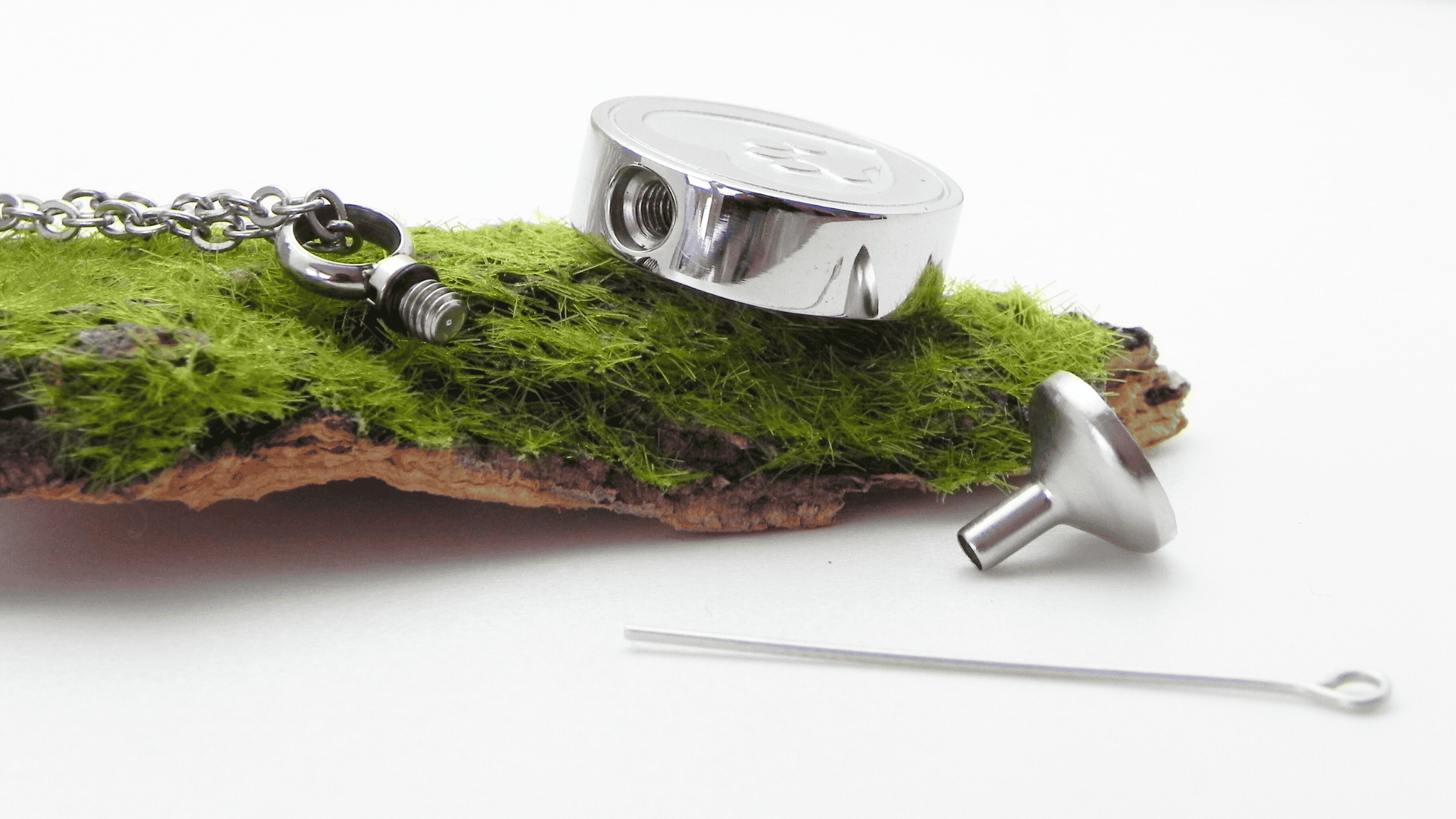 Naszyjnik wykonany z nierdzewnej stali chirurgicznej w kolorze srebrnym. W komplecie znajduje się malutki lejek, śrubokręt oraz szpatułka, które pomogą Ci umieścić prochy w środku naszyjnika. W komplecie znajduje się łańcuszek ze stali chirurgicznej.