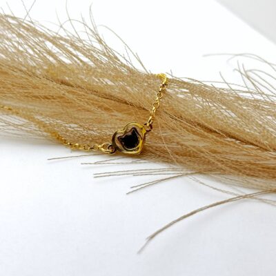 Srebrna bransoletka pozłacana w kształcie serduszka z głową kota z zamkniętą w środku sierścią. Możliwość zamówienia jej na łańcuszku lub regulowanym sznureczku makramowym w kolorze czarnym lub czerwonym. Bransoletka jest minimalistyczna, w środku mieści się bardzo symboliczna ilość sierści. Do jej stworzenia wystarczy zaledwie kilka włosków, które zostaną następnie pocięte i umieszczone w środku głowy kota na bezbarwnym tle.