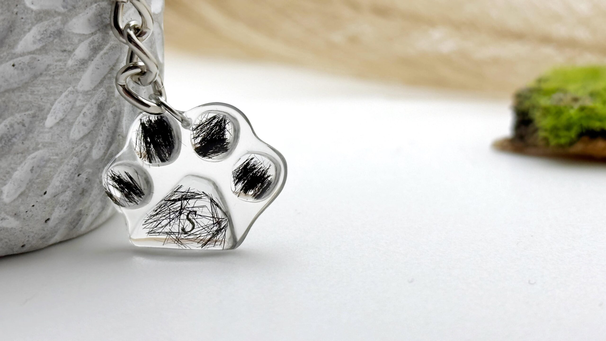 Brelok w kształcie łapki w całości wykonany z żywicy epoksydowej, a w środku zatopiona sierść lub prochy zwierząt.