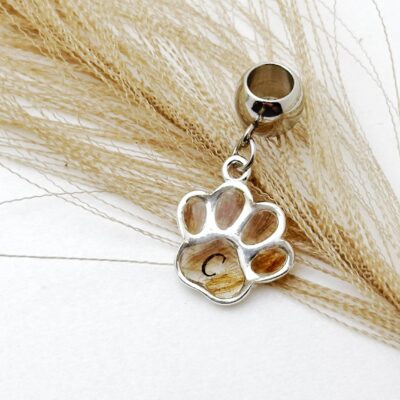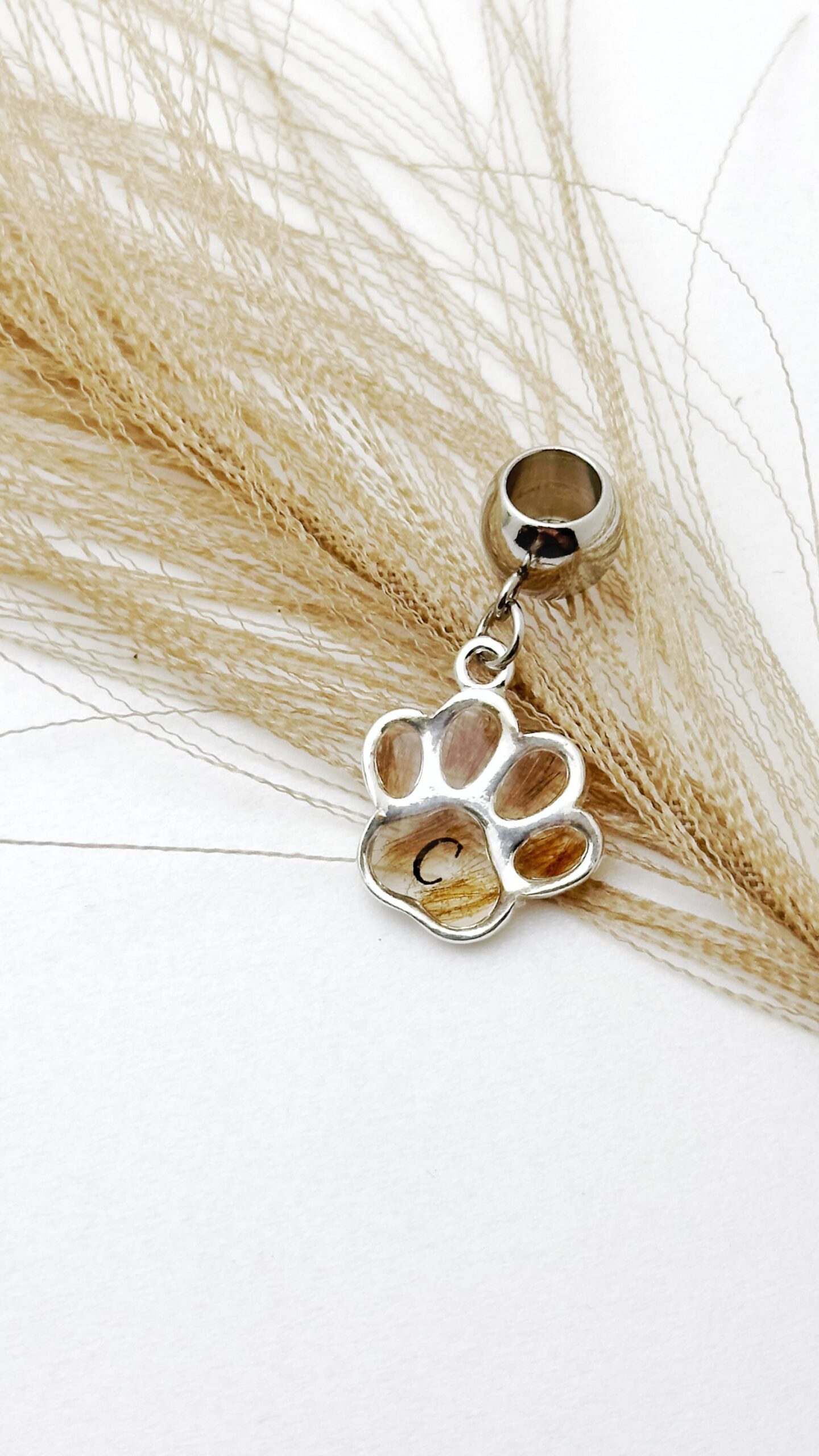Spersonalizowana zawieszka do bransoletki z zamkniętą w środku sierścią lub prochami zwierząt. Subtelna i delikatna biżuteria, którą można nosić na co dzień. Zawieszka wykonana jest ze srebra (próba 925) oraz dodatków ze stali chirurgicznej. Możliwość dodania również literki w centralnej części łapki. Zawieszka pasuje do każdego rodzaju bransoletek, również oryginalnej Pandory.