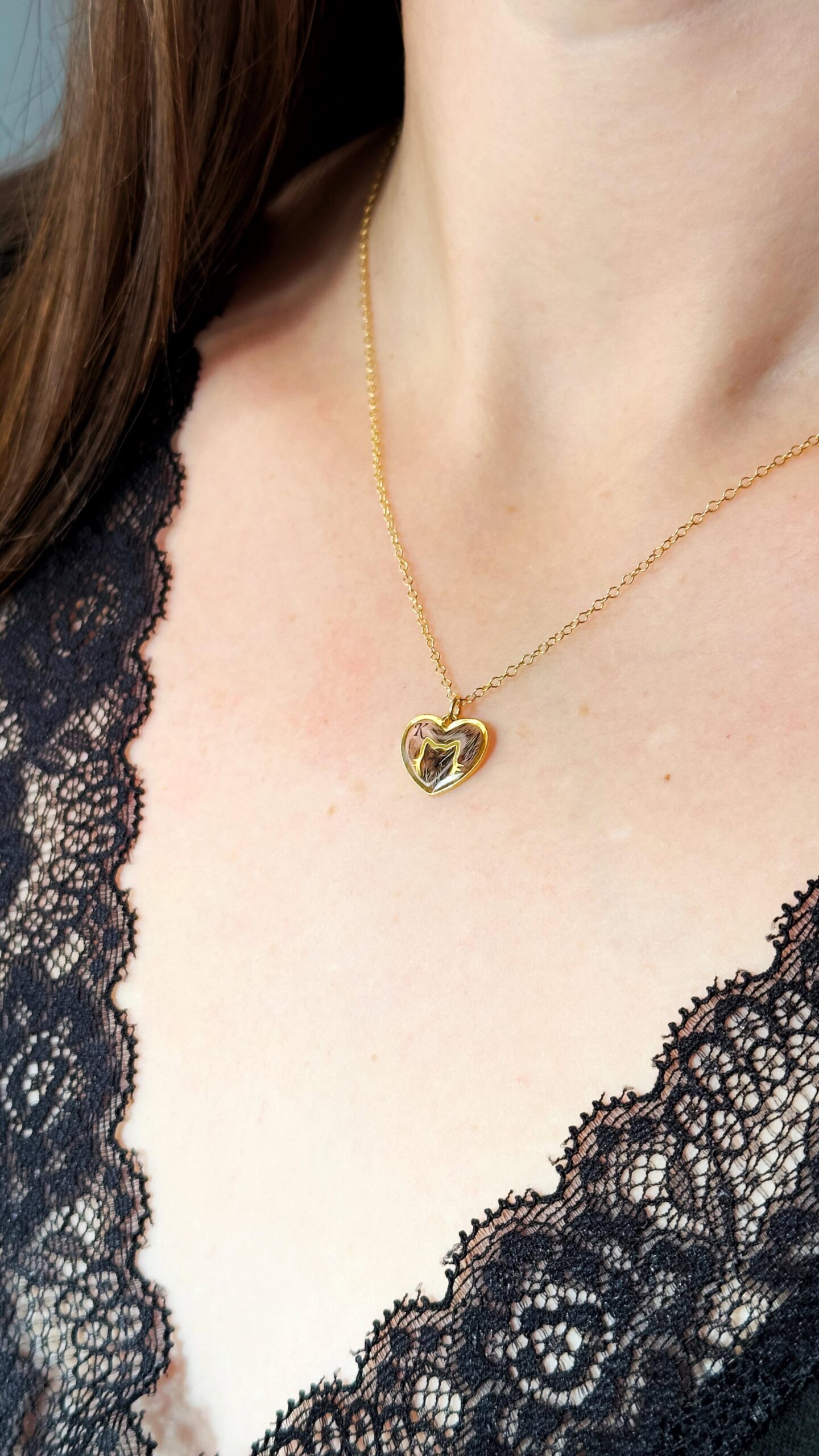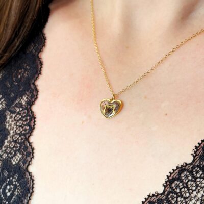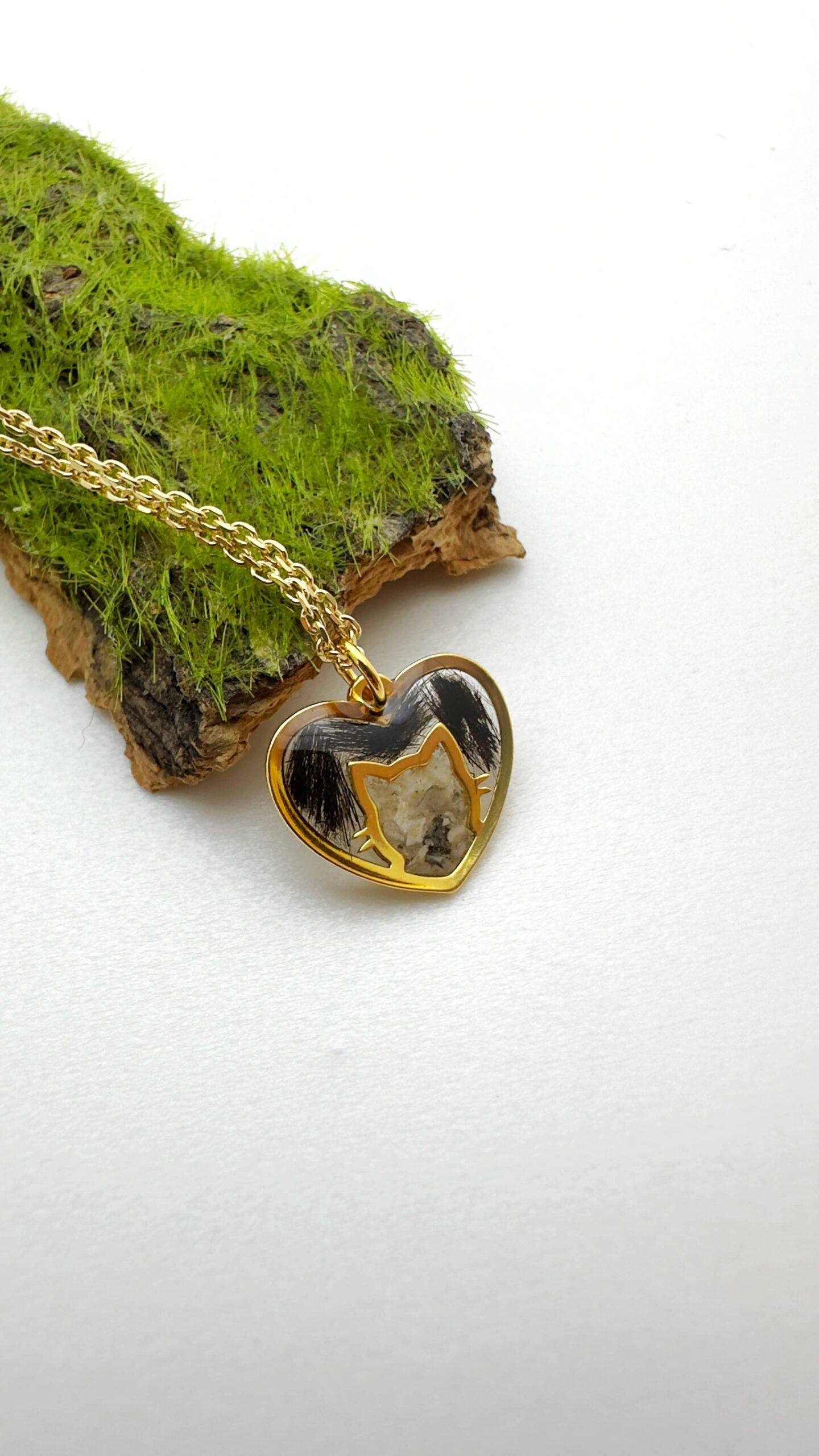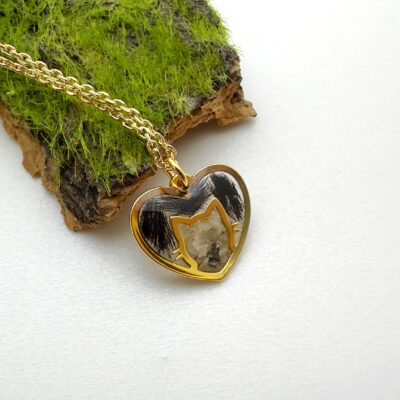 Minimalistyczny naszyjnik w kształcie serduszka z obrysem głowy kota z zamkniętą w środku sierścią. Całość wykonana z pozłacanego srebra (próba 925). To idealna propozycja dla kobiet ceniących sobie delikatną i subtelną biżuterię, która ma stanowić pamiątkę po zwierzęcym przyjacielu.