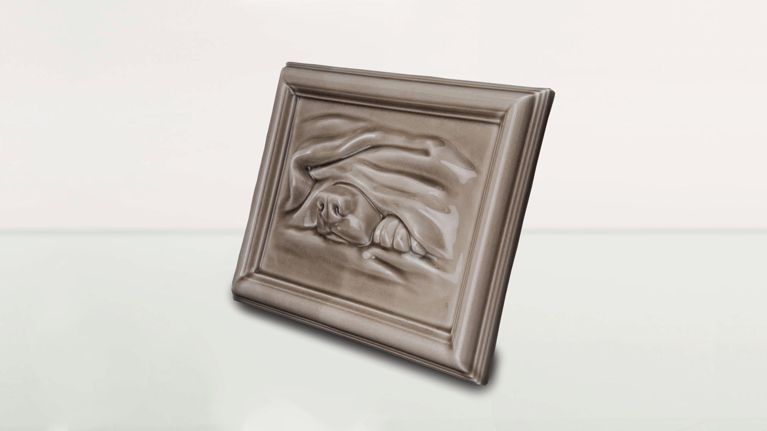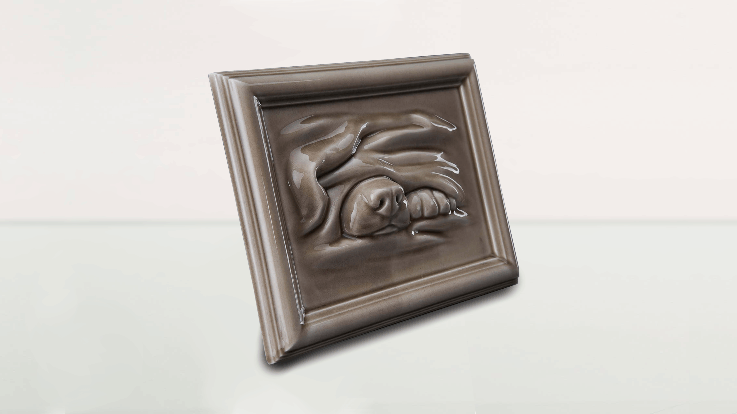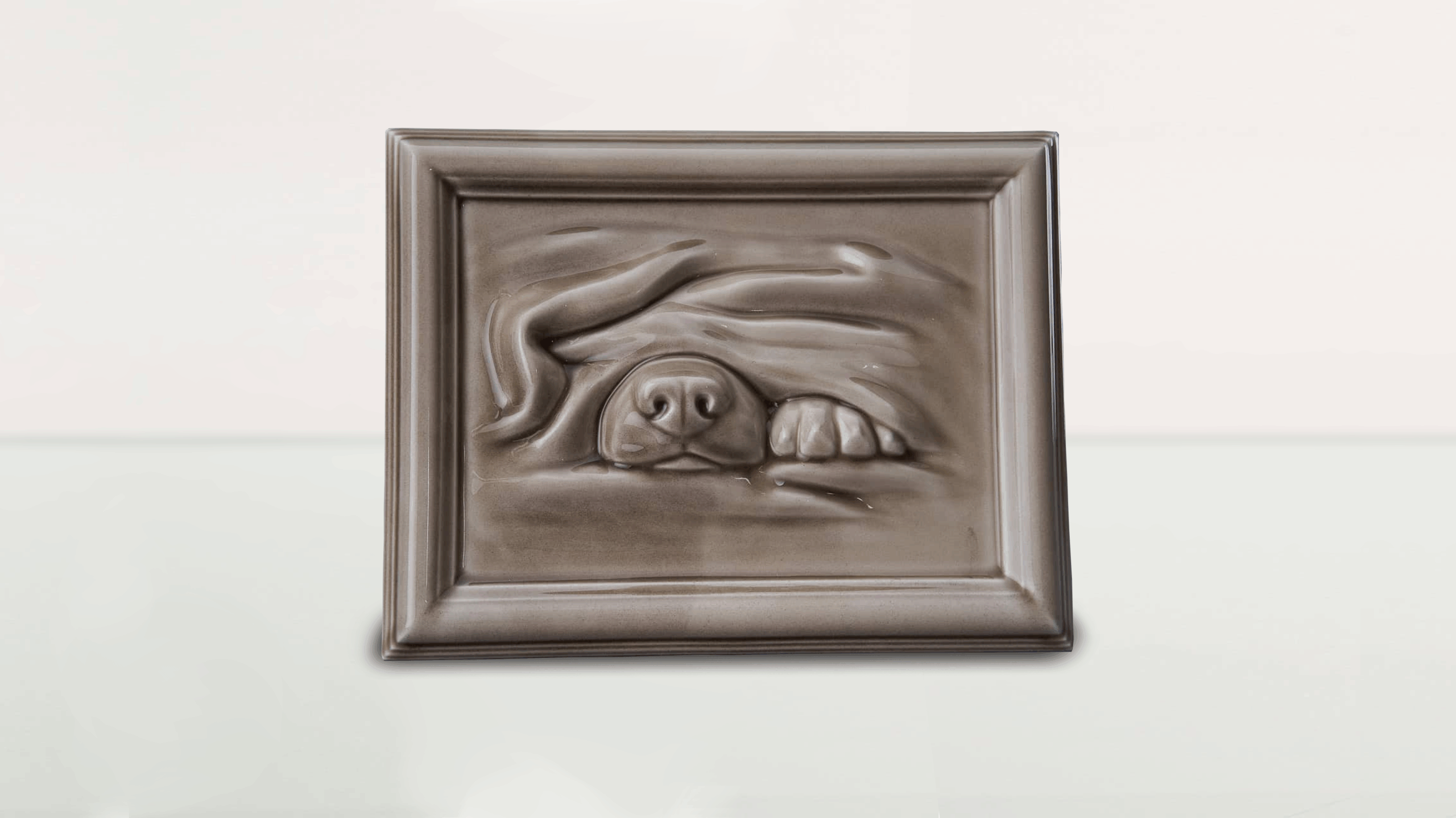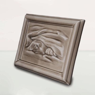 Elegancka ceramiczna urna pamiątkowa dla psa w formie płaskorzeźby umieszczonej w ramce. Wykonana z wysokiej jakości ceramiki, wykończona w beżowym kolorze z połyskiem. Subtelny motyw psa nadaje całości spokojny i godny charakter, odpowiedni do ekspozycji w domu.